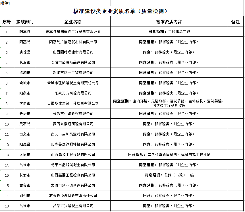 根据《建筑法》、《行政许可法》、《建设工程质量检测管理办法》等及我省有关规定,现将我厅依法审查核准的阳高县建园建设工程检测有限公司等18家建设工程质量检测机构予以公布。