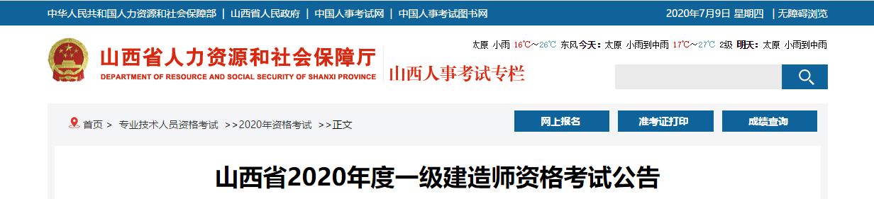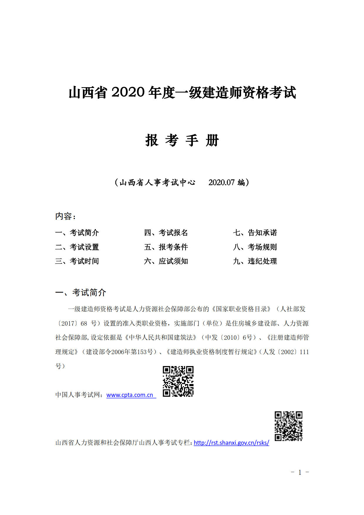2020年度一级建造师资格考试定于9月19日、20日举行。有关考试简介、考试设置、考试时间、考试报名、考试条件、应试须知、告知承诺、考场规则、违纪处理等,请认真阅读《山西省2020年度一级建造师考试报考手册》(以下简称《报考手册》)。
