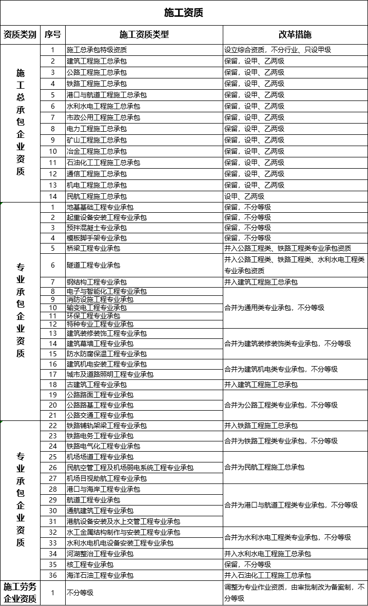 2014年11月,住建部将专业承包资质由60个压缩至36个。
