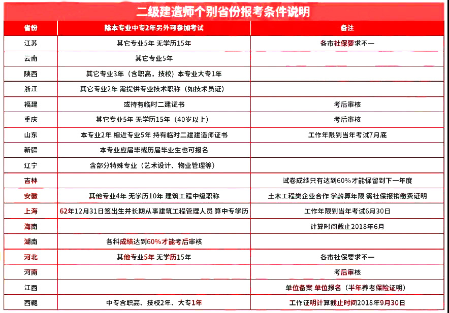 二级建造师各省条件暂时有略微的区别,详细内容见下表: