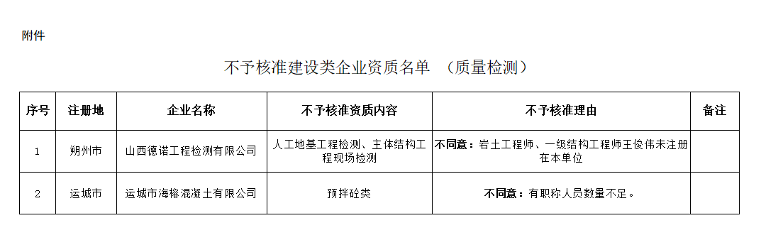 根据《建设工程质量检测管理办法》等及我省有关规定,经我厅依法审查,决定对不符合许可条件的山西德诺工程检测有限公司等2家工程质量检测机构下达不予核准行政许可决定书,请做好相关工作。