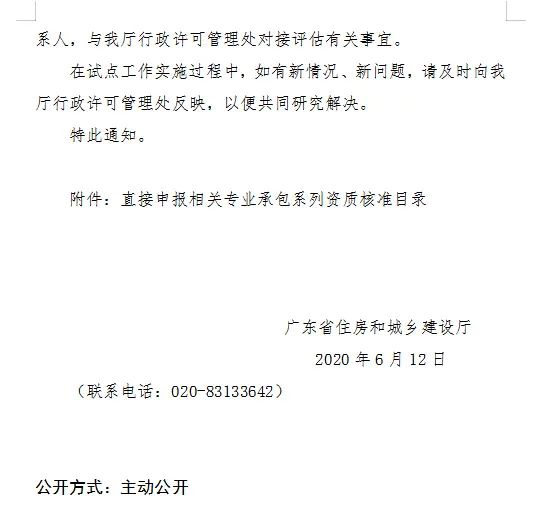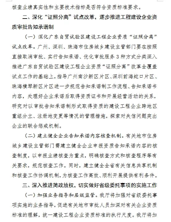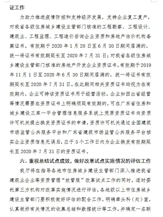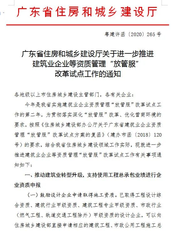 导读:广东省住建厅《关于进一步推进建筑业企业等资质管理“放管服”改革试点工作的通知》: