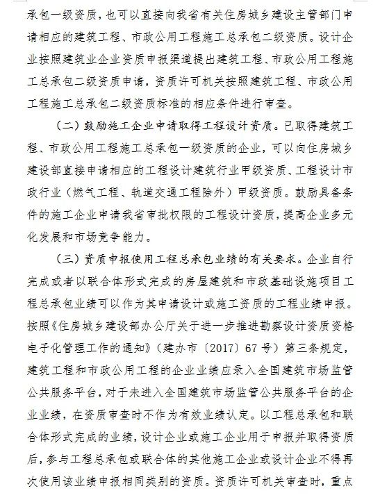 (一)鼓励设计企业申请取得施工资质。已取得工程设计综合资质、建筑行业甲级资质、建筑工程专业甲级资质、市政行业(燃气工程、轨道交通工程除外)甲级资质的设计企业,可以向住房城乡建设部直接申请相应的建筑工程、市政公用工程施工总承包一级资质,也可以直接向我省有关住房城乡建设主管部门申请相应的建筑工程、市政公用工程施工总承包二级资质。