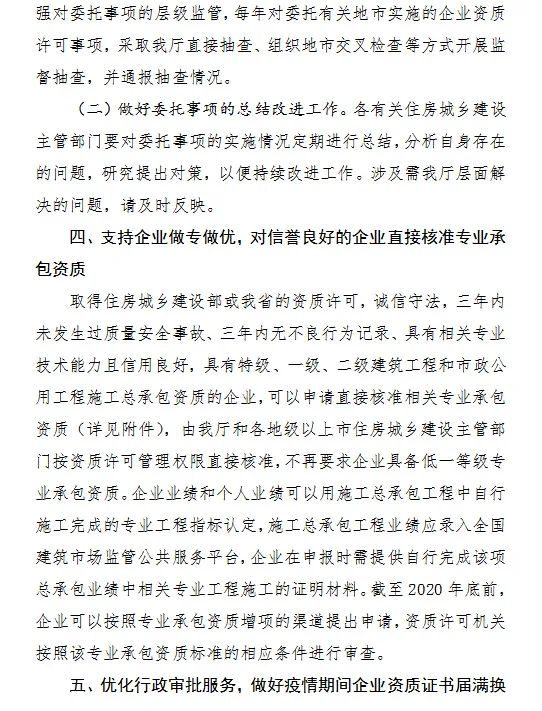 信誉良好的企业直接核准专业承包资质。诚信守法,3年内未发生过质量安全事故、三年内无不良行为记录、具有相关专业技术能力且信用良好,具有一级、二级建筑工程和市政公用工程施工总承包资质的企业,可以申请直接核准相关专业承包资质,由省厅和我局按资质许可管理权限直接核准,不再要求企业具备低一等级专业承包资质。申请截止时间为2020年底前。