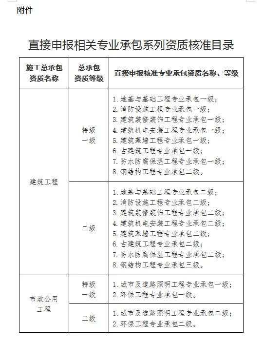 (三)信誉良好的企业直接核准专业承包资质。诚信守法,三年内未发生过质量安全事故、三年内无不良行为记录、具有相关专业技术能力且信用良好,具有一级、二级建筑工程和市政公用工程施工总承包资质的企业,可以申请直接核准相关专业承包资质(详见附件),由省厅和我局按资质许可管理权限直接核准,不再要求企业具备低一等级专业承包资质。申请截至时间为2020年底前。