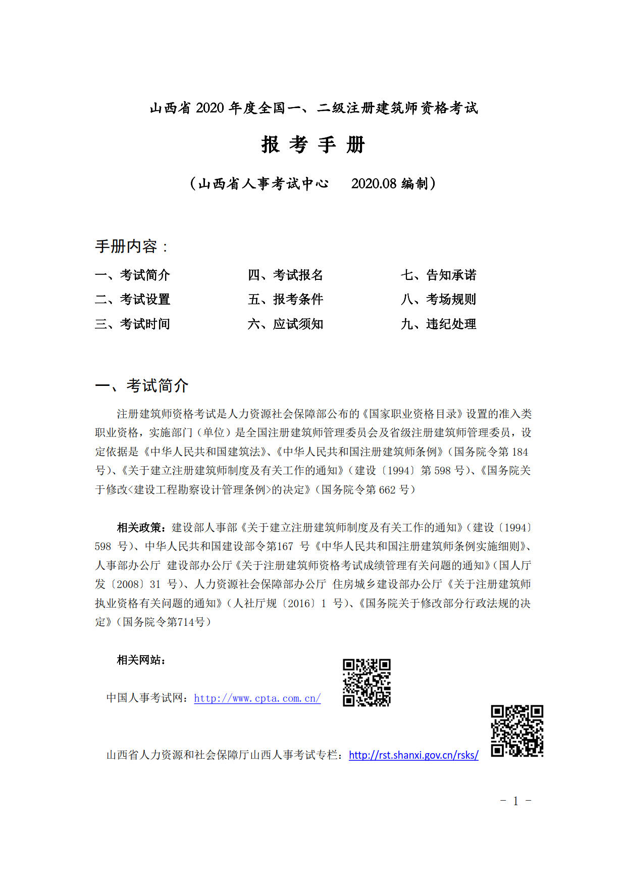 2020年度全国一级注册建筑师资格考试定于10 月17日、18日、24日、25日2 个连续的周末举行,二级注册建筑师考试定于10 月17 日、18日举行。有关考试简介、考试设置、考试时间、考试报名、考试条件、应试须知、告知承诺、考场规则、违纪处理等,请认真阅读《山西省2020年度全国一、二级注册建筑师资格考试报考手册》(以下简称《报考手册》)。