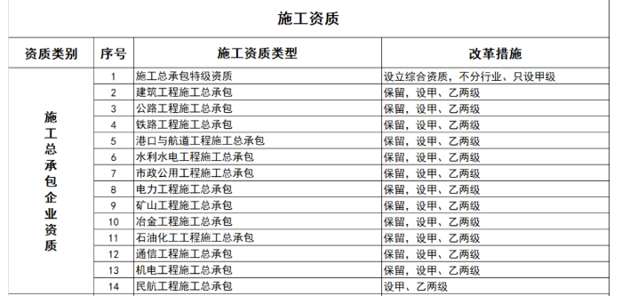 其中施工总承包特级资质调整为施工综合资质,施工总承包一、二、三级资质等级压减为甲、乙两级,甲级资质在本类别内承揽业务规模不受限制,原一级资质调整为甲级资质,其他等级资质合并为乙级资质。
