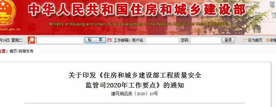 2020年4月8日《住房和城乡建设部工程质量安全监管司2020年工作要点》下发,其中明确提出: