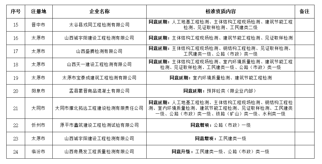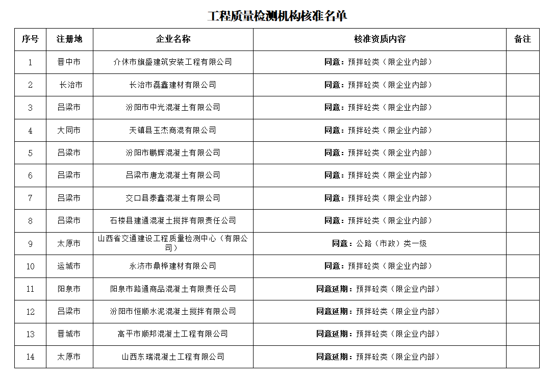 根据《中华人民共和国建筑法》、《行政许可法》、《建设工程质量检测管理办法》等及我省有关规定,现将我厅依法审查核准的介休市旗盛建筑安装工程有限公司等24家建设工程质量检测机构予以公布。
