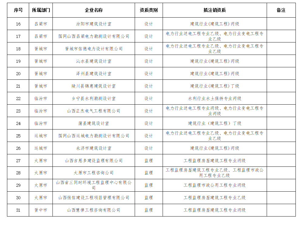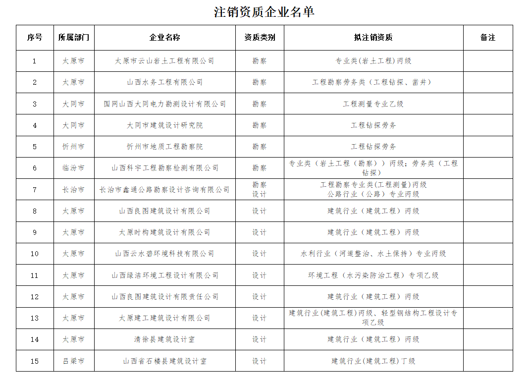 根据《建设工程勘察设计资质管理规定》(建设部令第160号)第二十五条、二十七条,《工程监理企业资质管理规定》(建设部令第158号)第二十三条、二十五条规定,太原市云山岩土工程有限公司等64家企业(详见附件)不具备现有资质条件,我厅于2020年9月9日至9月23日在厅网站将以上拟注销、撤回资质的64家企业信息进行了公示。公示期内,上述企业未提出不同意见。经研究,决定依法注销、撤回太原市云山岩土工程有限公司等64家企业相关资质。