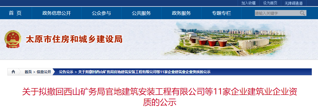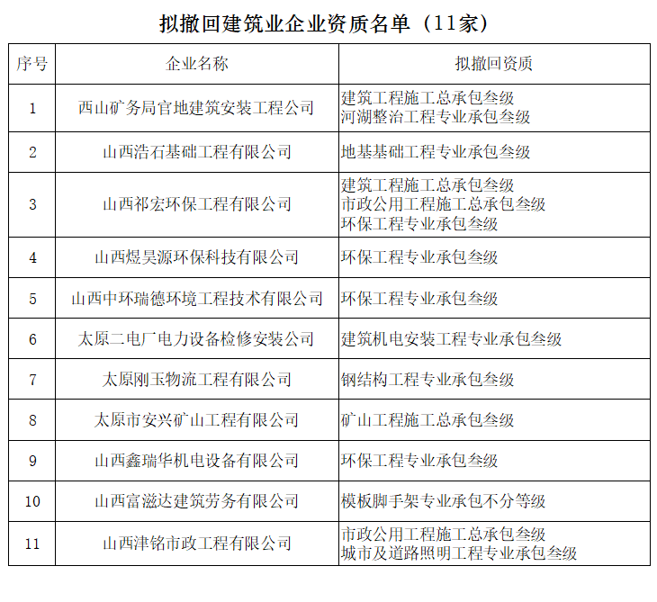 根据《建筑业企业资质管理规定》(住房城乡建设部第22号令)第四章第二十四条、二十八条规定,西山矿务局官地建筑安装工程有限公司等11家企业未达到建筑业企业资质标准要求,且未按要求限期整改到位,我局拟撤回以上企业相关建筑业企业资质,现将以上拟撤回资质的企业相关信息进行公示。公示时间为:2020年10月23日至11月6日,以上企业可在11月3日前向我局提出书面陈述、申辩材料,逾期不陈述、申辩,视为放弃上述权利。公示期满后,我局将依据规定撤回企业相关建筑业企业资质。