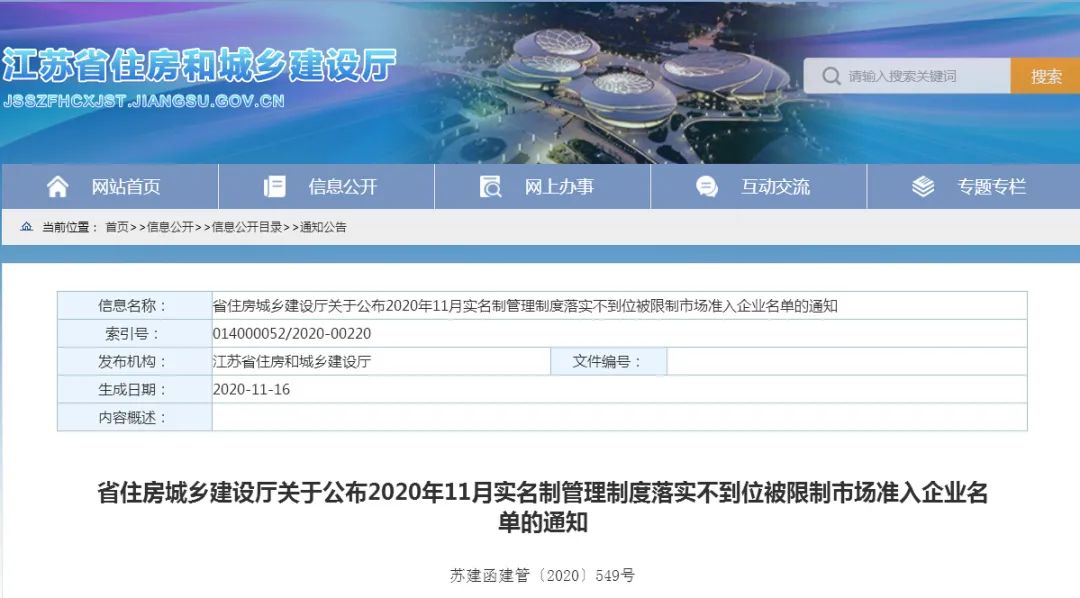 近日,江苏省住建厅公布了《2020年11月实名制管理制度落实不到位被限制市场准入企业名单》: