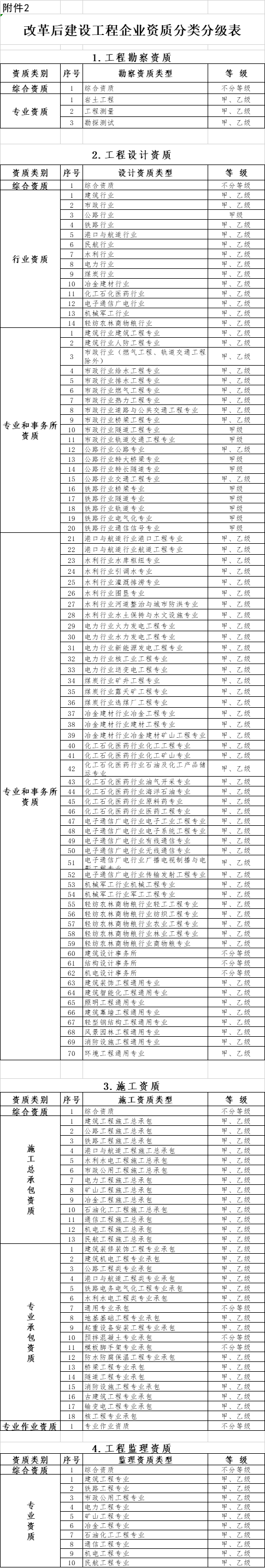 建设工程企业资质管理制度改革方案 为贯彻落实2019年全国深化“放管服”改革优化营商环境电视电话会议精神和李克强总理重要讲话精神,按照《国务院办公厅关于印发全国深化“放管服”改革优化营商环境电视电话会议重点任务分工方案的通知》(国办发〔2019〕39号)要求,深化建筑业“放管服”改革,做好建设工程企业资质(包括工程勘察、设计、施工、监理企业资质,以下统称企业资质)认定事项压减工作,现制定以下改革方案。 一、指导思想 以习近平新时代中国特色社会主义思想为指导,贯彻落实党的十九大和十九届二中、三中、四中、五中全会精神,充分发挥市场在资源配置中的决定性作用,更好发挥政府作用,坚持以推进建筑业供给侧结构性改革为主线,按照国务院深化“放管服”改革部署要求,持续优化营商环境,大力精简企业资质类别,归并等级设置,简化资质标准,优化审批方式,进一步放宽建筑市场准入限制,降低制度性交易成本,破除制约企业发展的不合理束缚,持续激发市场主体活力,促进就业创业,加快推动建筑业转型升级,实现高质量发展。 二、主要内容 (一)精简资质类别,归并等级设置。为在疫情防控常态化条件下做好“六稳”工作、落实“六保”任务,进一步优化建筑市场营商环境,确保新旧资质平稳过渡,保障工程质量安全,按照稳中求进的原则,积极稳妥推进建设工程企业资质管理制度改革。对部分专业划分过细、业务范围相近、市场需求较小的企业资质类别予以合并,对层级过多的资质等级进行归并。改革后,工程勘察资质分为综合资质和专业资质,工程设计资质分为综合资质、行业资质、专业和事务所资质,施工资质分为综合资质、施工总承包资质、专业承包资质和专业作业资质,工程监理资质分为综合资质和专业资质。资质等级原则上压减为甲、乙两级(部分资质只设甲级或不分等级),资质等级压减后,中小企业承揽业务范围将进一步放宽,有利于促进中小企业发展。具体压减情况如下: 1.工程勘察资质。保留综合资质;将4类专业资质及劳务资质整合为岩土工程、工程测量、勘探测试等3类专业资质。综合资质不分等级,专业资质等级压减为甲、乙两级。 2.工程设计资质。保留综合资质;将21类行业资质整合为14类行业资质;将151类专业资质、8类专项资质、3类事务所资质整合为70类专业和事务所资质。综合资质、事务所资质不分等级;行业资质、专业资质等级原则上压减为甲、乙两级(部分资质只设甲级)。 3.施工资质。将10类施工总承包企业特级资质调整为施工综合资质,可承担各行业、各等级施工总承包业务;保留12类施工总承包资质,将民航工程的专业承包资质整合为施工总承包资质;将36类专业承包资质整合为18类;将施工劳务企业资质改为专业作业资质,由审批制改为备案制。综合资质和专业作业资质不分等级;施工总承包资质、专业承包资质等级原则上压减为甲、乙两级(部分专业承包资质不分等级),其中,施工总承包甲级资质在本行业内承揽业务规模不受限制。 4.工程监理资质。保留综合资质;取消专业资质中的水利水电工程、公路工程、港口与航道工程、农林工程资质,保留其余10类专业资质;取消事务所资质。综合资质不分等级,专业资质等级压减为甲、乙两级。 (二)放宽准入限制,激发企业活力。住房和城乡建设部会同国务院有关主管部门制定统一的企业资质标准,大幅精简审批条件,放宽对企业资金、主要人员、工程业绩和技术装备等的考核要求。适当放宽部分资质承揽业务规模上限,多个资质合并的,新资质承揽业务范围相应扩大至整合前各资质许可范围内的业务,尽量减少政府对建筑市场微观活动的直接干预,充分发挥市场在资源配置中的决定性作用。 (三)下放审批权限,方便企业办事。进一步加大放权力度,选择工作基础较好的地方和部分资质类别,开展企业资质审批权下放试点,将除综合资质外的其他等级资质,下放至省级及以下有关主管部门审批(其中,涉及公路、水运、水利、通信、铁路、民航等资质的审批权限由国务院住房和城乡建设主管部门会同国务院有关部门根据实际情况决定),方便企业就近办理。试点地方要明确专门机构、专业人员负责企业资质审批工作,并制定企业资质审批相关管理规定,确保资质审批权下放后地方能够接得住、管得好。企业资质全国通用,严禁各行业、各地区设置限制性措施,严厉查处变相设置市场准入壁垒,违规限制企业跨地区、跨行业承揽业务等行为,维护统一规范的建筑市场。 (四)优化审批服务,推行告知承诺制。深化“互联网+政务服务”,加快推动企业资质审批事项线上办理,实行全程网上申报和审批,逐步推行电子资质证书,实现企业资质审批“一网通办”,并在全国建筑市场监管公共服务平台公开发布企业资质信息。简化各类证明事项,凡是通过政府部门间信息共享可以获取的证明材料,一律不再要求企业提供。加快推行企业资质审批告知承诺制,进一步扩大告知承诺制使用范围,明确审批标准,逐步提升企业资质审批的规范化和便利化水平。 (五)加强事中事后监管,保障工程质量安全。坚持放管结合,加大资质审批后的动态监管力度,创新监管方式和手段,全面推行“双随机、一公开”监管方式和“互联网+监管”模式,强化工程建设各方主体责任落实,加大对转包、
