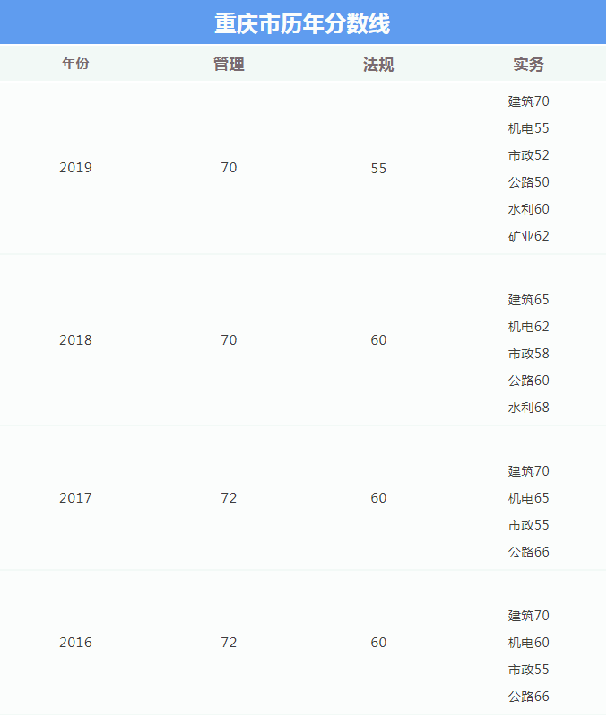 重庆市2020年度二级建造师执业资格考试《建设工程施工管理》科目合格标准为65分(试卷满分120分)、《建设工程法规及相关知识》科目合格标准为55分(试卷满分100分),《专业工程管理与实务》科目(6个专业类别)合格标准为55分(试卷满分120分)。