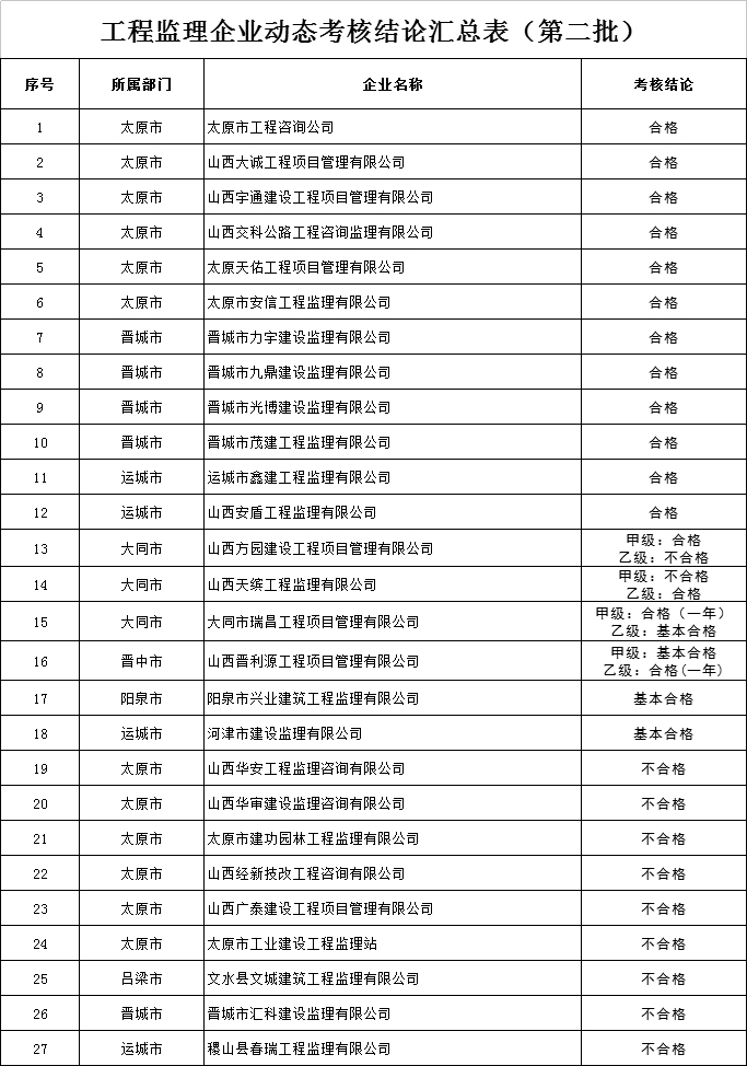 根据《关于发布2017年度建设工程企业资质动态考核公示意见暨第一批考核结论的通知》(晋建市函[2018]636号),我厅组织人员对企业提交的资质动态考核申述材料进行了审查,现将考核结论予以公布(附件1-3),并就有关事项通知如下:
